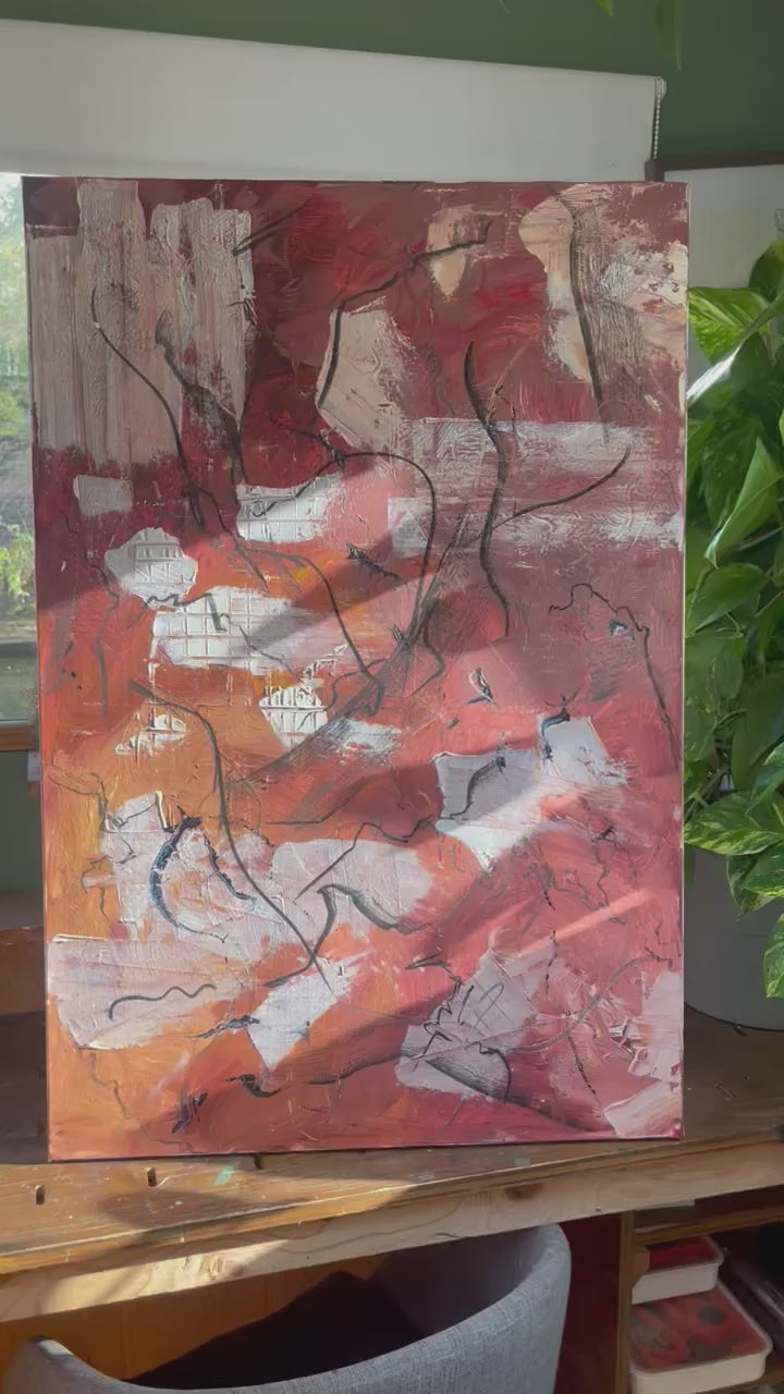 This series explores the complexities of emotion and memory and how they are conveyed through paint and material. Applying a solid base of layered paint and working on top of it with thin, defined charcoal lines creates an intertwining of order and chaos.