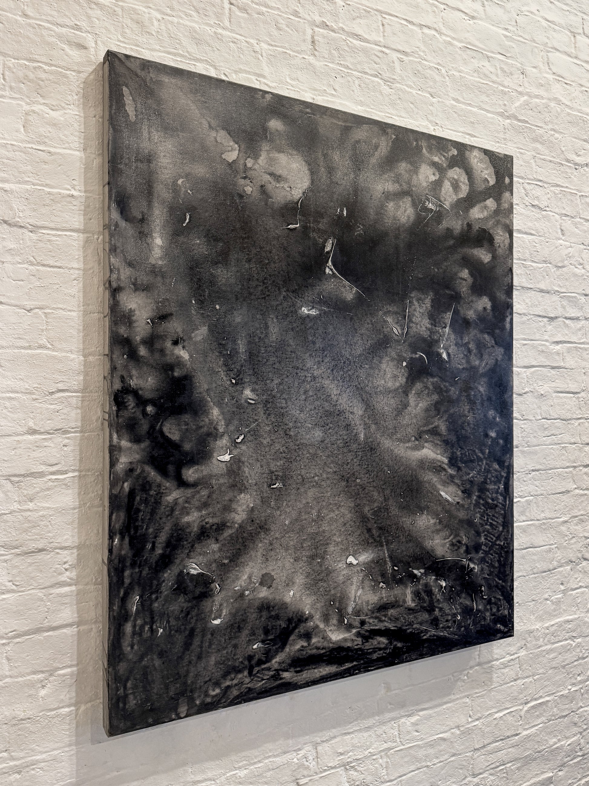 Acrylic and ink on box canvas, exploring processes of erosion, staining, and accumulation, where gesture and material interaction evoke a landscape suspended between presence and erasure.